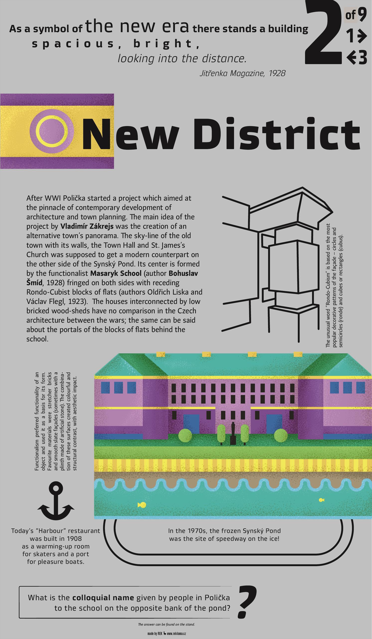 The new district behind the pond is one of the model examples of quality town planning. In the first stage (blocks of flats 1922 – 1923), modern Rondo-Cubism was used for architectural design with distinctive two-color façades (ocher – brick red, ocher – ultramarine blue, brick red – ultramarine blue). All carpentry and plumbing elements were gray-blue. Masaryk boys’ and girls‘ Primary and civic school (today‘s Masaryk Primary school) is functionalist and, without the use of any decorative elements, it impresses the viewer with its structuring and the material used – red bricks, silver-gray rough plaster and artificial stone wainscoting. The silhouette of the waterfront ends with the Evangelical Church (1937).