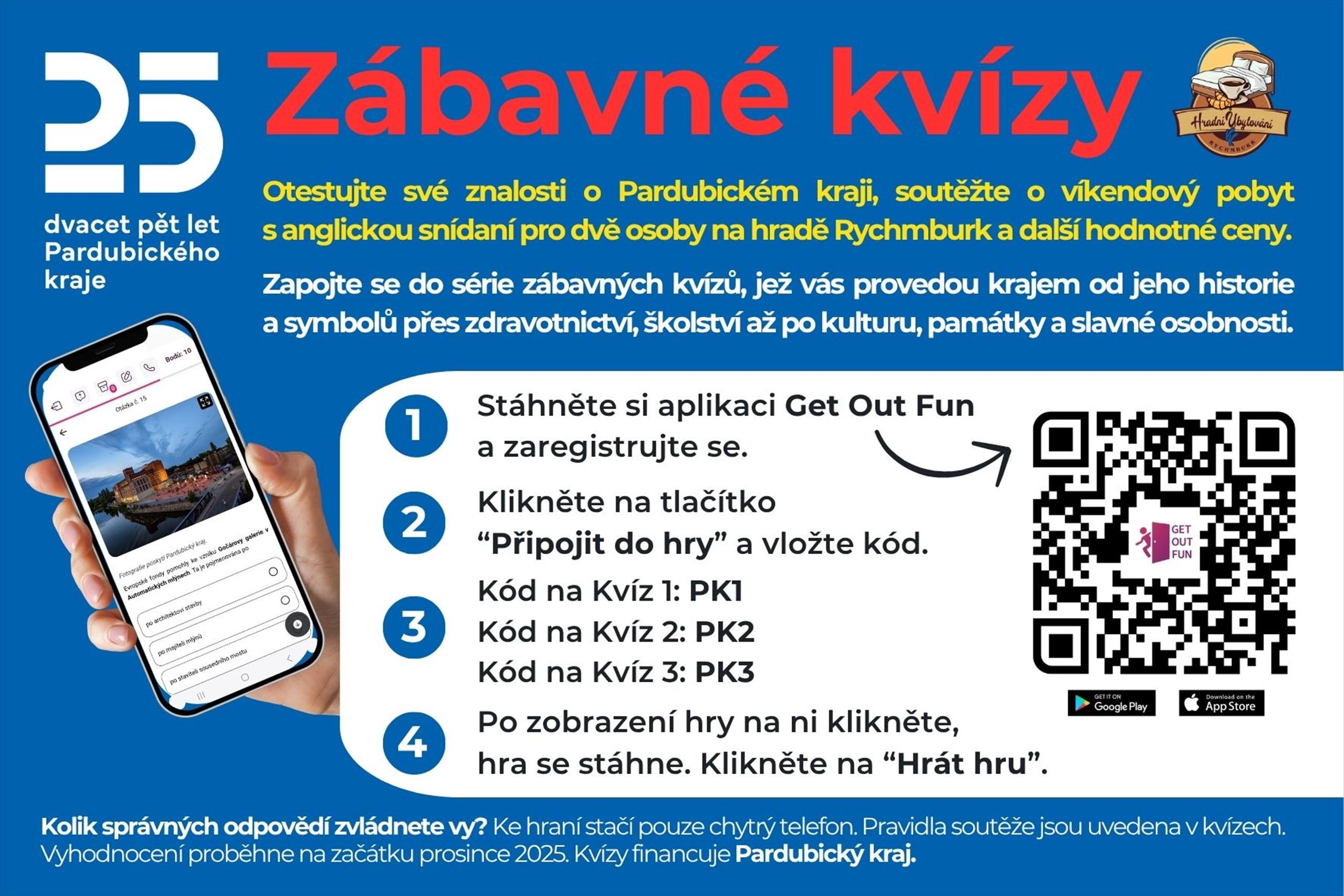 Dnem Pardubického kraje v pátek odstartovala série tří nových kvízů na platformě Get Out Fun. Zájemci si je mohou luštit jen pro zábavu, nebo se mohou přihlásit do soutěže o ceny. Hlavní cenou je víkendový pobyt pro dva s anglickou snídaní z Hradní spižírny na hradě Rychmburk v sezóně 2026. Soutěž potrvá do 30. listopadu 2025 a výherce bude vylosován začátkem prosince. Kvíz byl vytvořen jako součást oslav 25 let od vzniku Pardubického kraje.