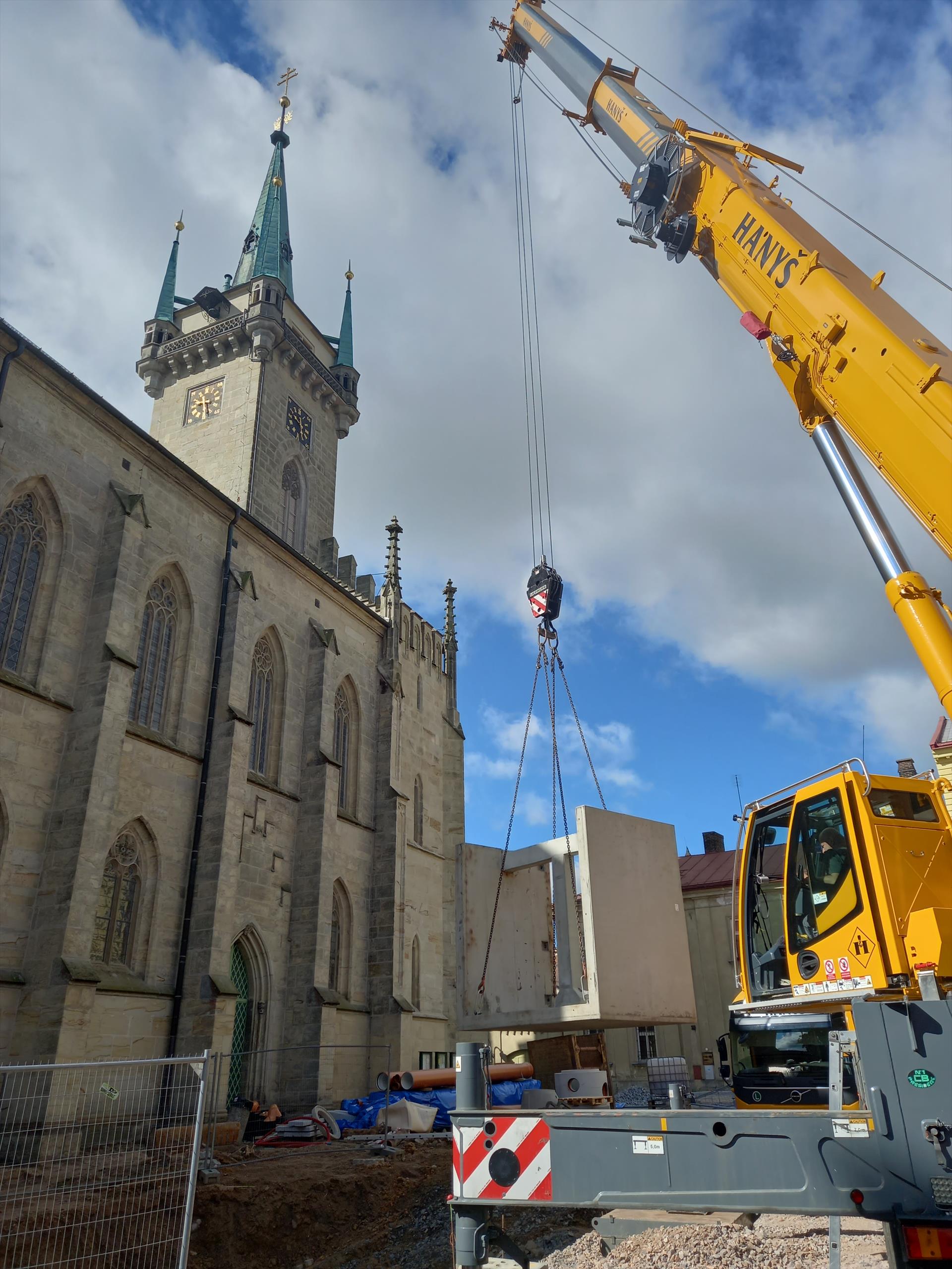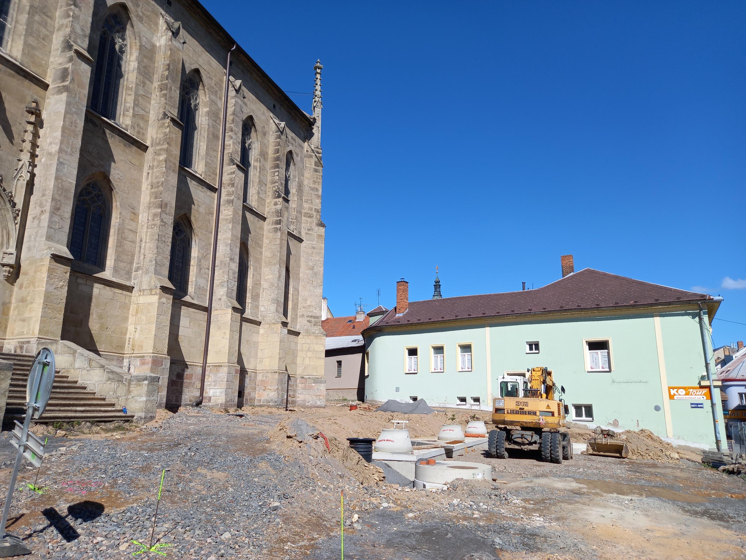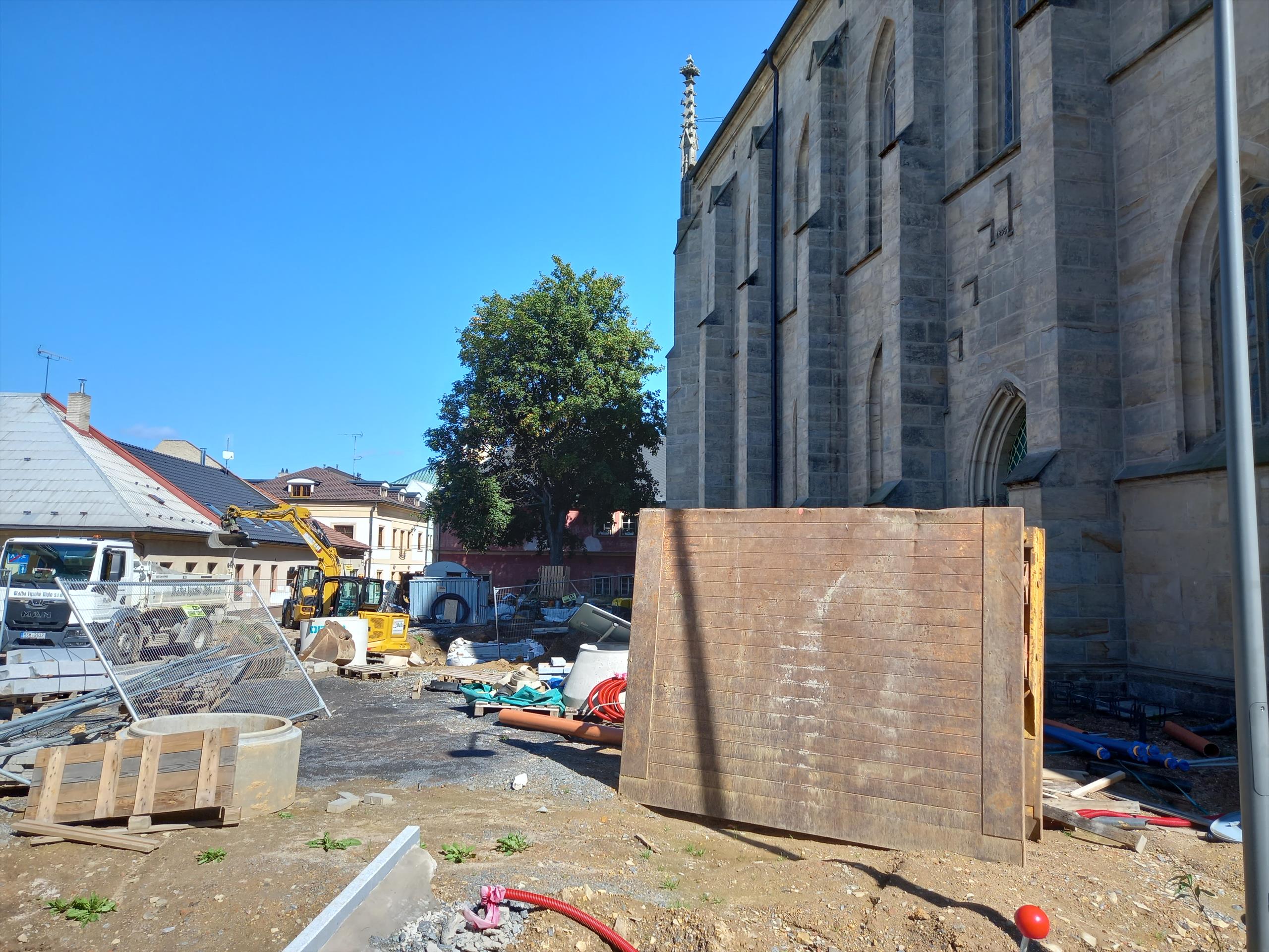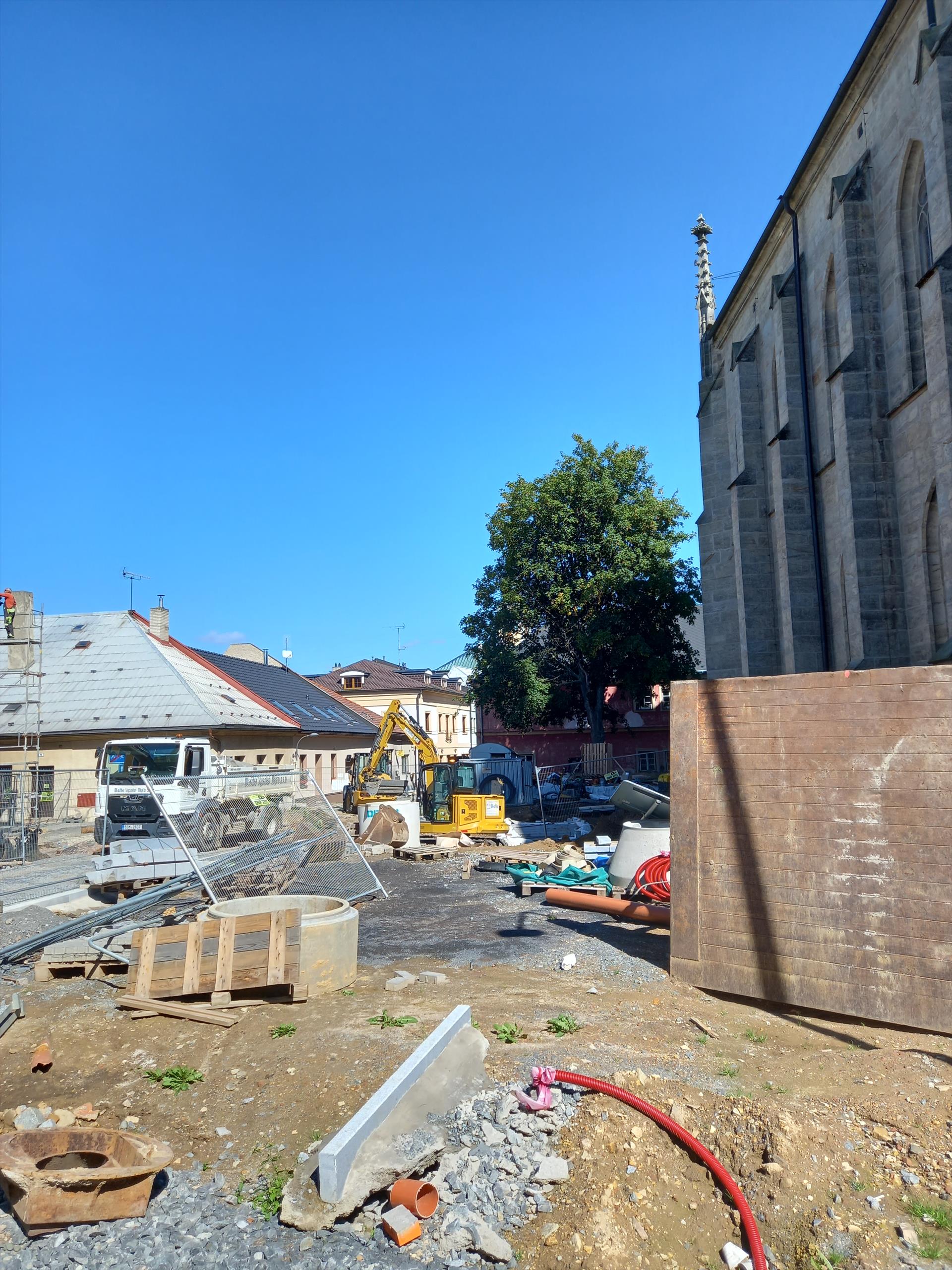 V letních měsících proběhlo osazení retenční nádrže pod kostelem a s tím související práce. Pomocí těžké techniky byla osazena i technická místnost na náměstí B. Martinů (umístění technologie pro funkci budoucí kašny a vodních prvků). Dokončena je komunikace včetně chodníku ze žulových dlažebních kostek a mozaiky z ulice Riegrova do ulice Václavská, osazeny byly i pískovcové kvádry před farou. Zde bude umístěn mostek, který bude bezbariérově spojovat faru s náměstím. V současné době převažuje provádění zemních prací pro inženýrské sítě: budování a překládání kanalizace, vodovodu, elektroinstalace, veřejného osvětlení a realizace speciálního zavlažovací systému. Příští rok bude osazena i kašna, na které probíhají nyní sochařské práce v ateliéru. Dokončena jsou i parkovací stání před Mozaikou. Nutno dodat, že práce probíhají plně v souladu s časovým harmonogramem.