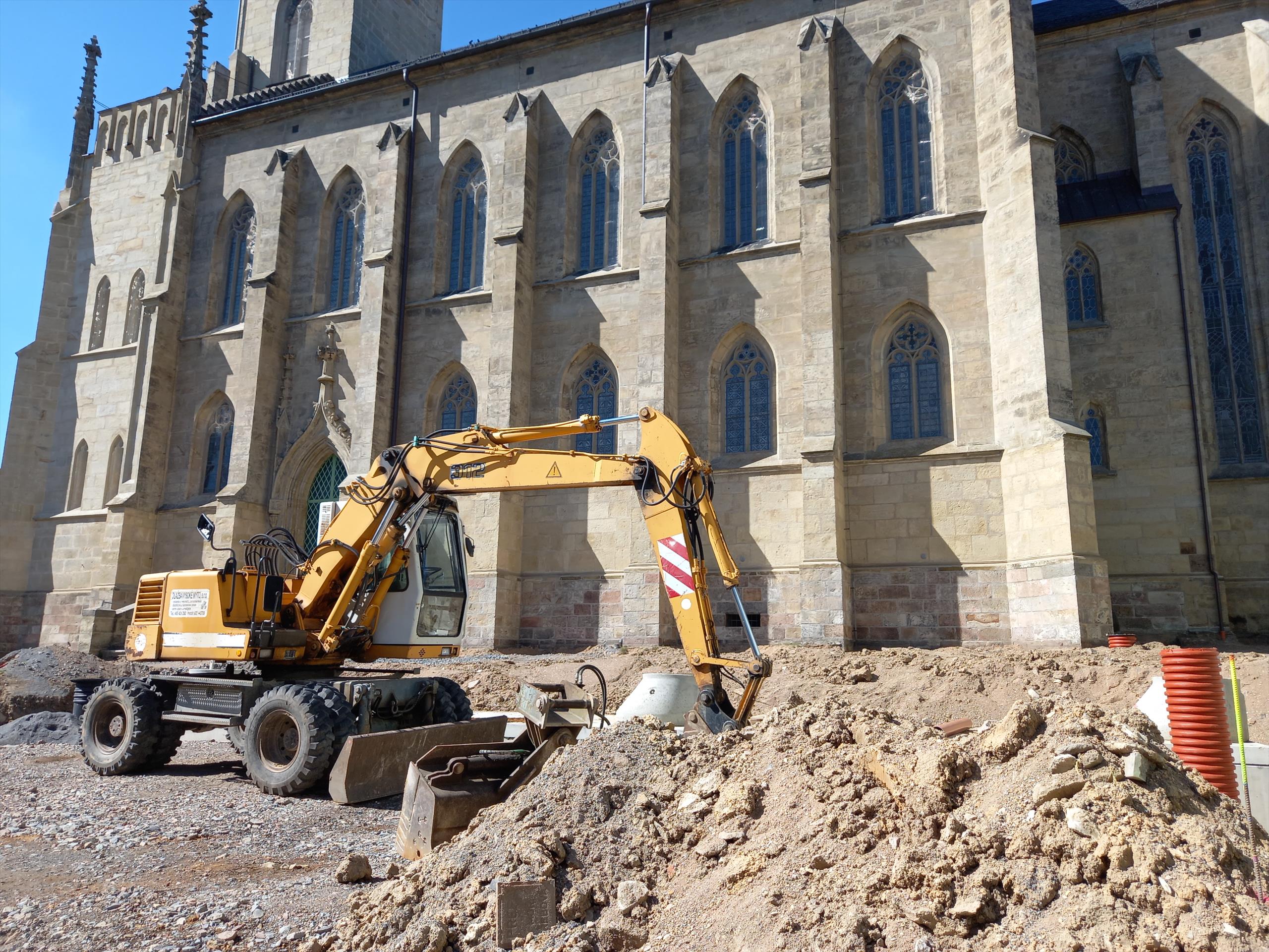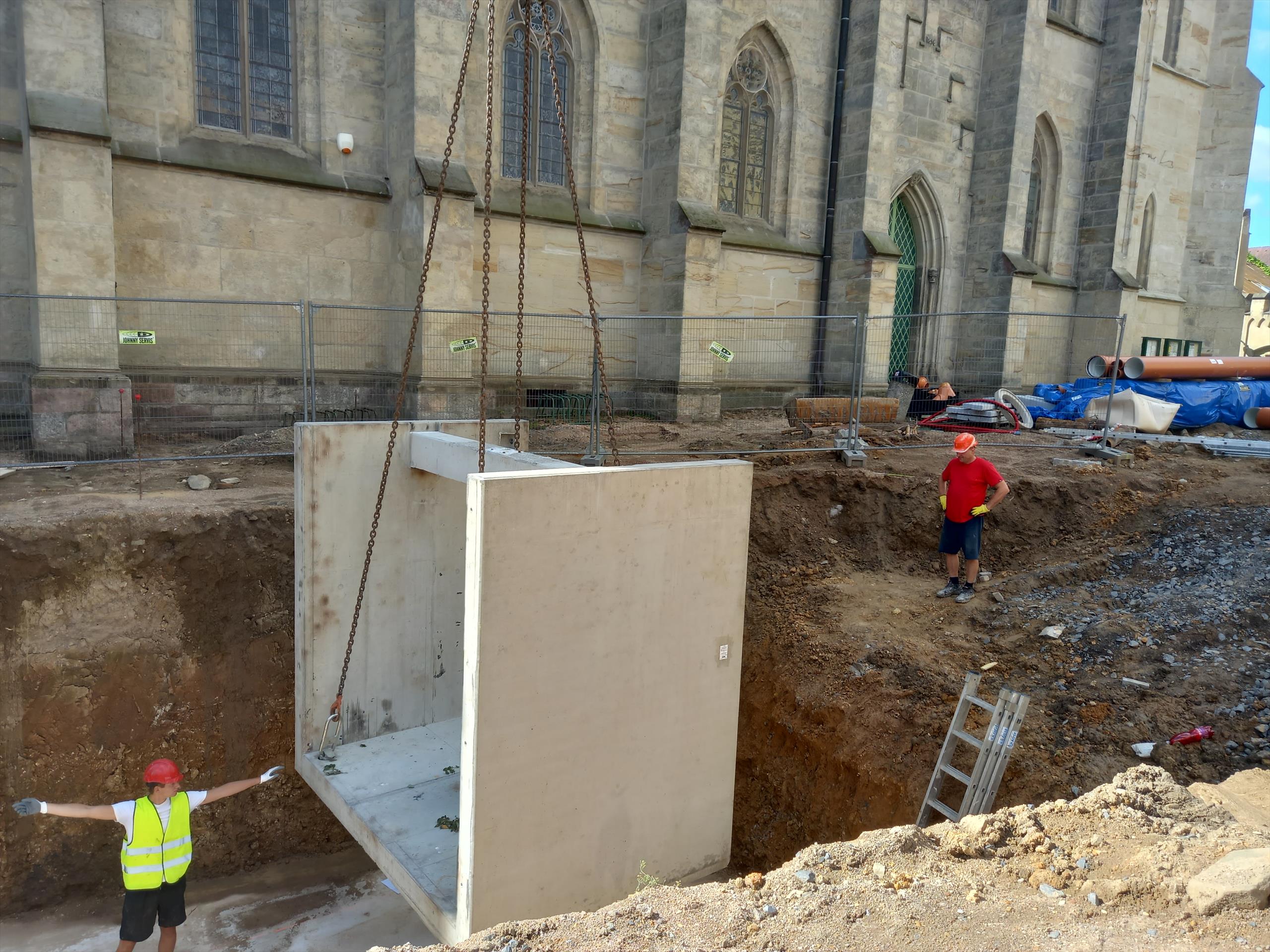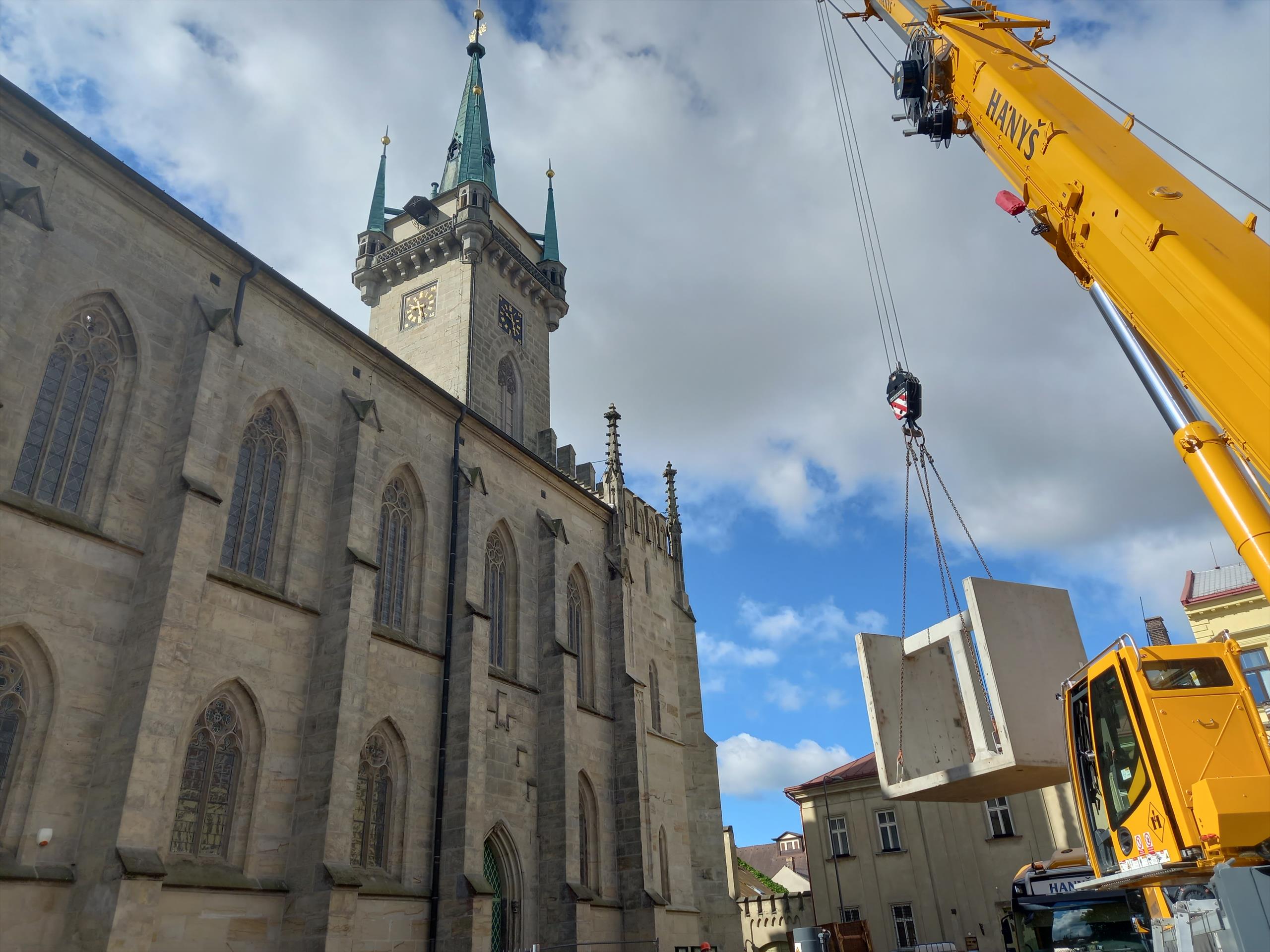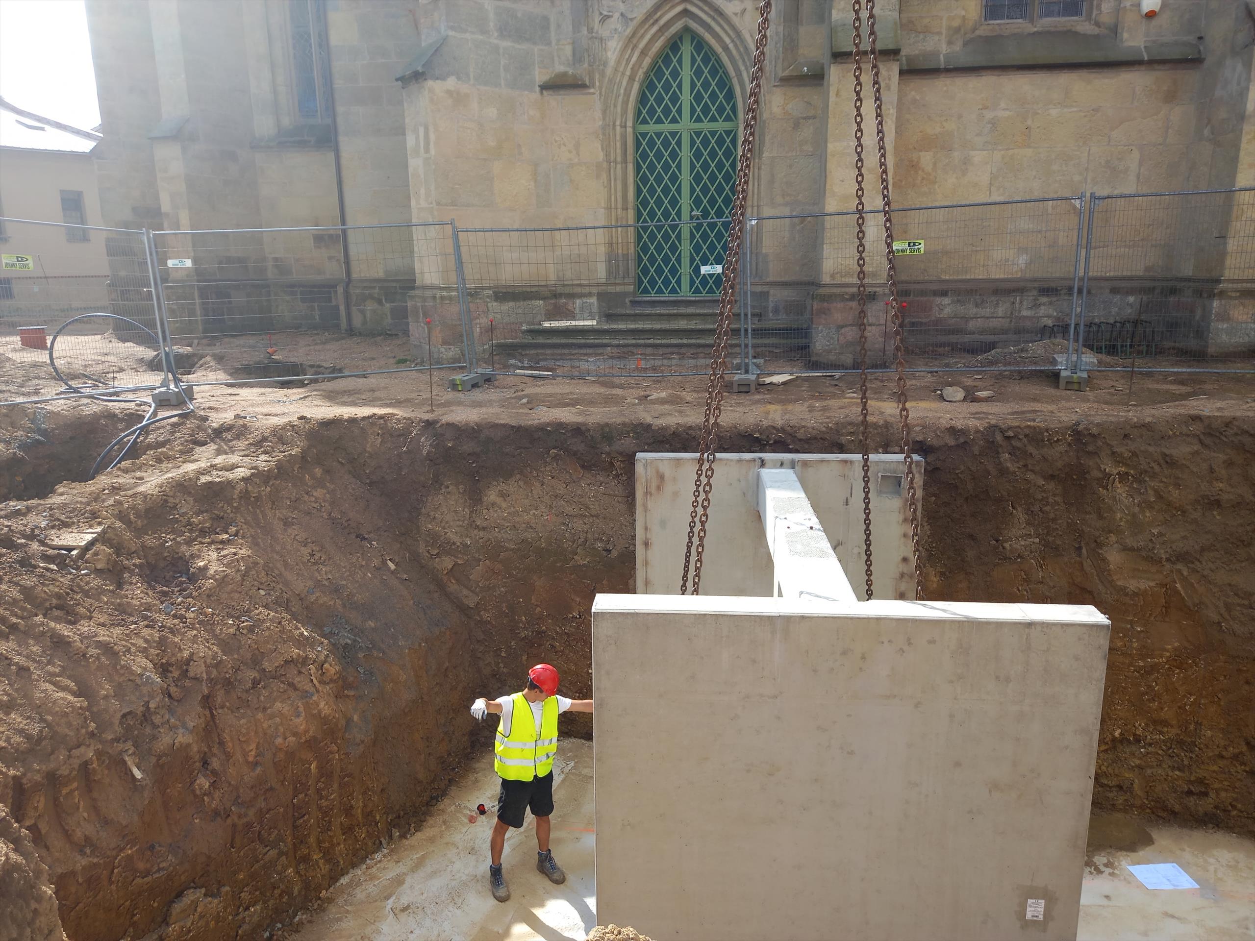V letních měsících proběhlo osazení retenční nádrže pod kostelem a s tím související práce. Pomocí těžké techniky byla osazena i technická místnost na náměstí B. Martinů (umístění technologie pro funkci budoucí kašny a vodních prvků). Dokončena je komunikace včetně chodníku ze žulových dlažebních kostek a mozaiky z ulice Riegrova do ulice Václavská, osazeny byly i pískovcové kvádry před farou. Zde bude umístěn mostek, který bude bezbariérově spojovat faru s náměstím. V současné době převažuje provádění zemních prací pro inženýrské sítě: budování a překládání kanalizace, vodovodu, elektroinstalace, veřejného osvětlení a realizace speciálního zavlažovací systému. Příští rok bude osazena i kašna, na které probíhají nyní sochařské práce v ateliéru. Dokončena jsou i parkovací stání před Mozaikou. Nutno dodat, že práce probíhají plně v souladu s časovým harmonogramem.