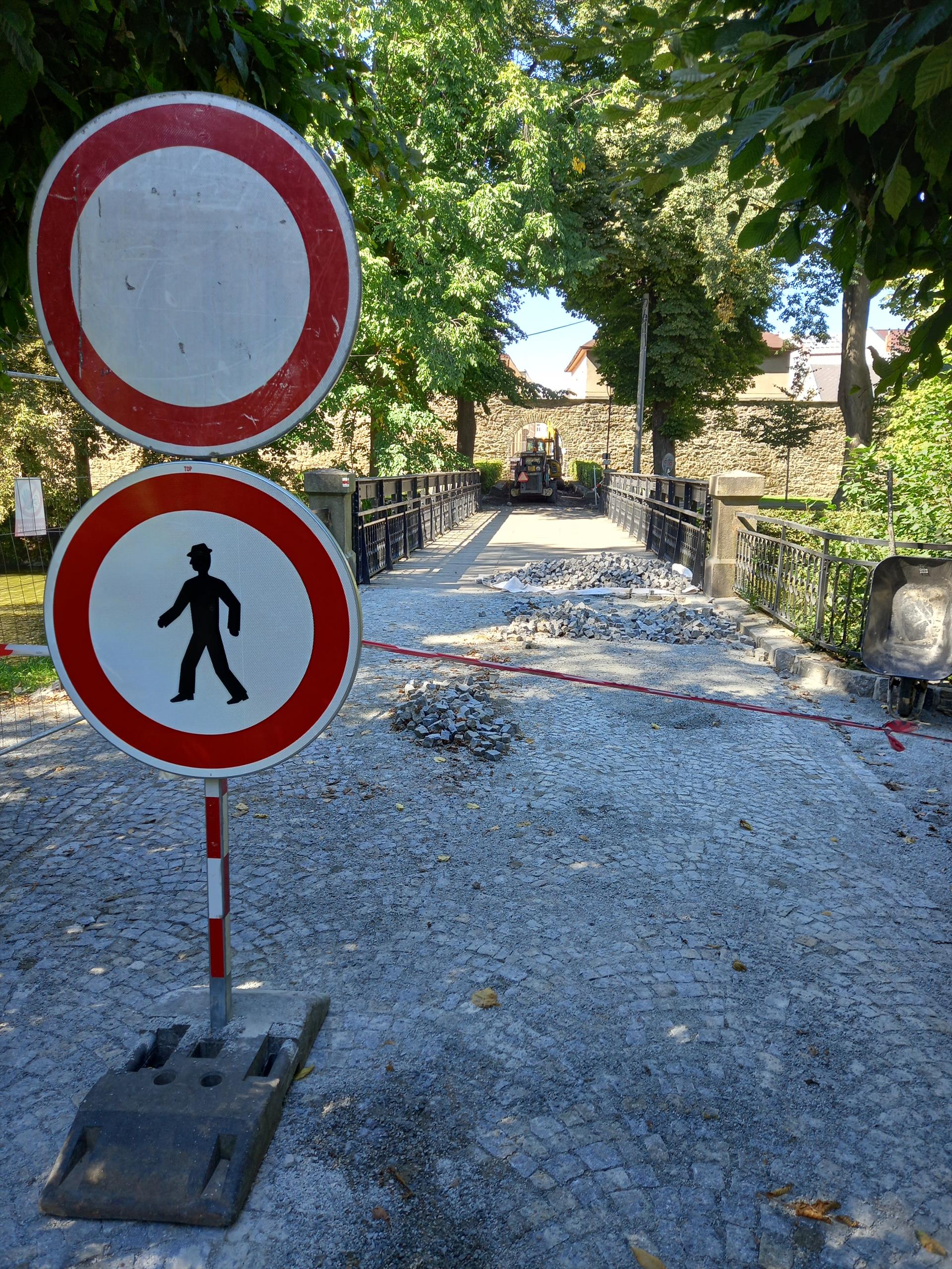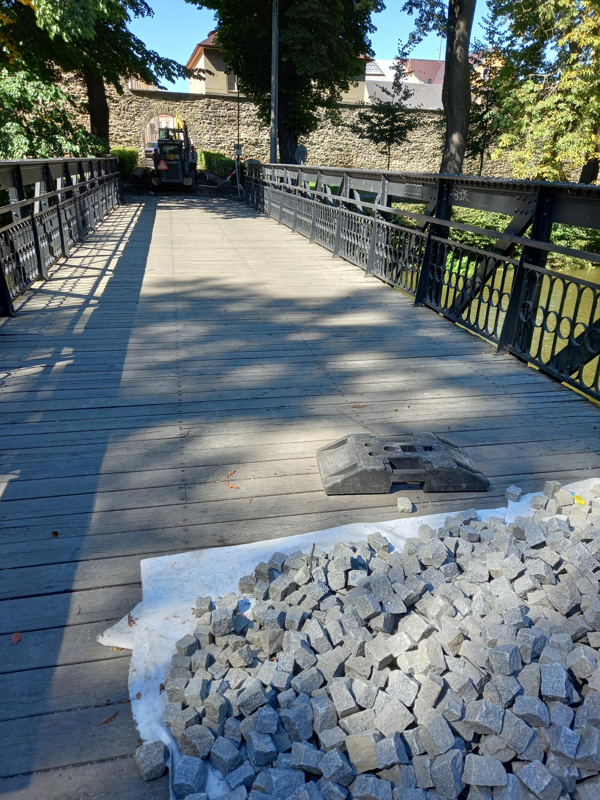Vzhledem k výše uvedené probíhající opravě jsou pro chodce uzavřeny části navazující z obou stran na hlavní most včetně mostu samotného. Žádáme proto chodce, aby používali lávku u dětského hřiště. Za případné komplikace se tímto omlouváme.