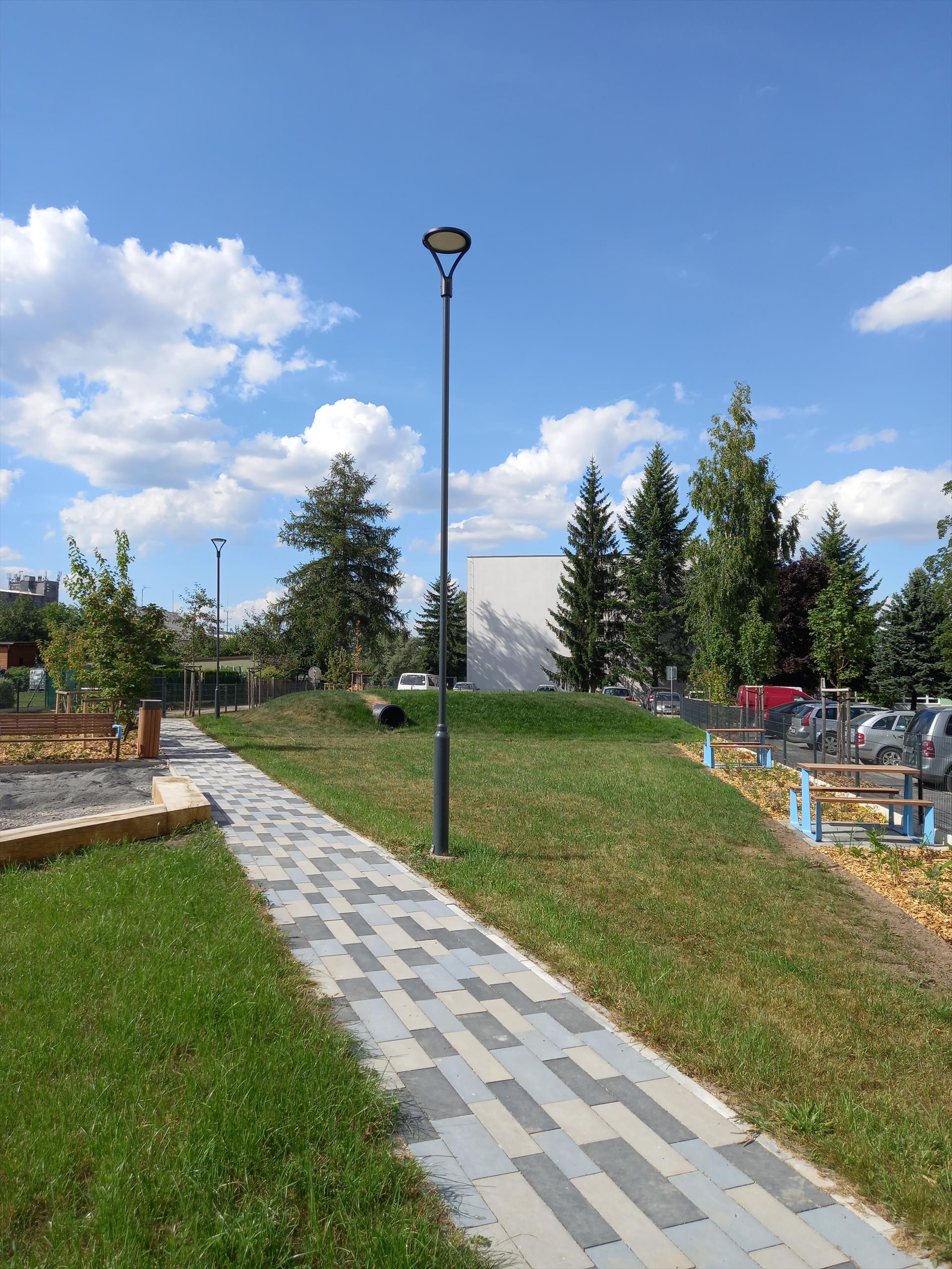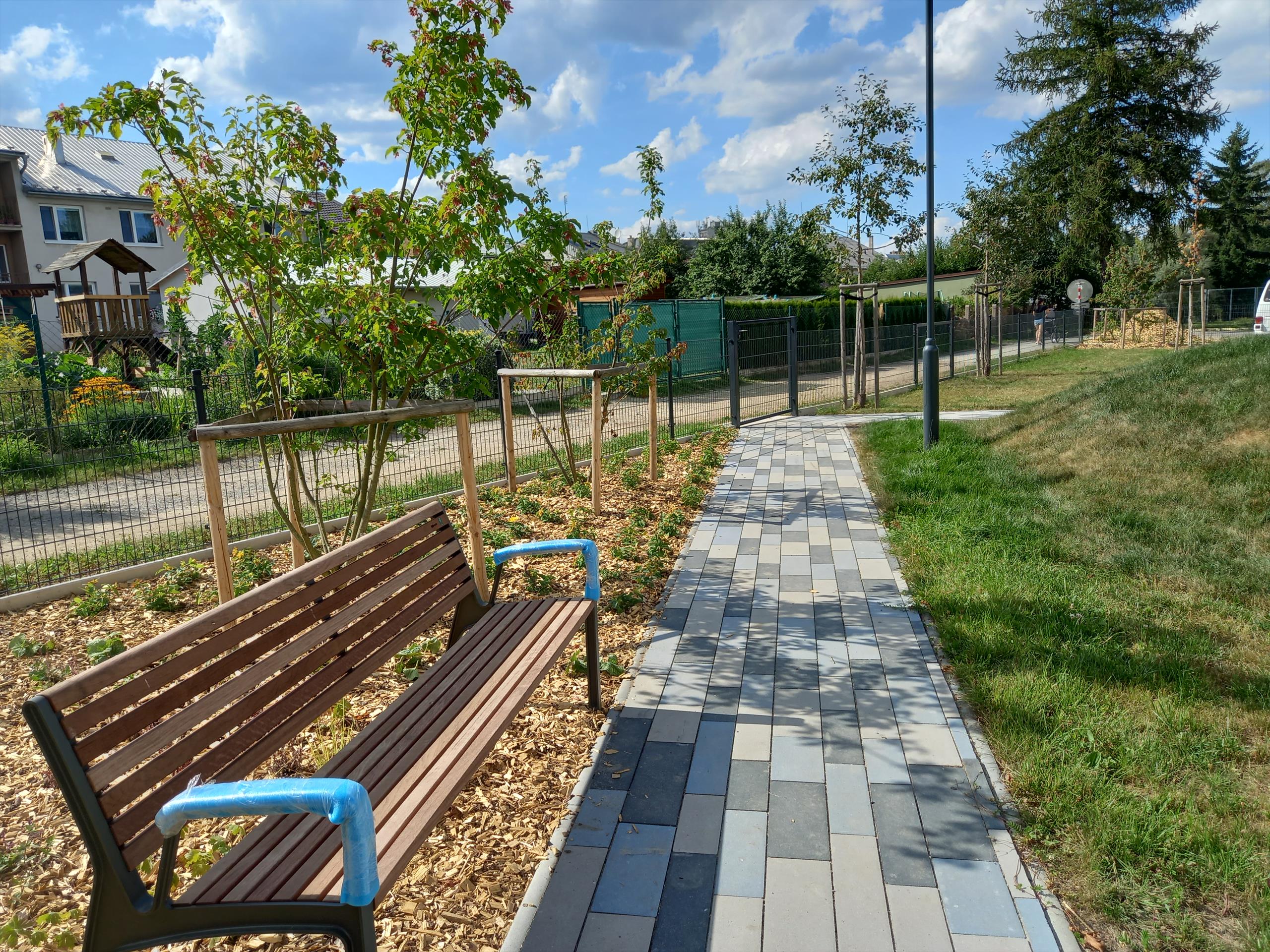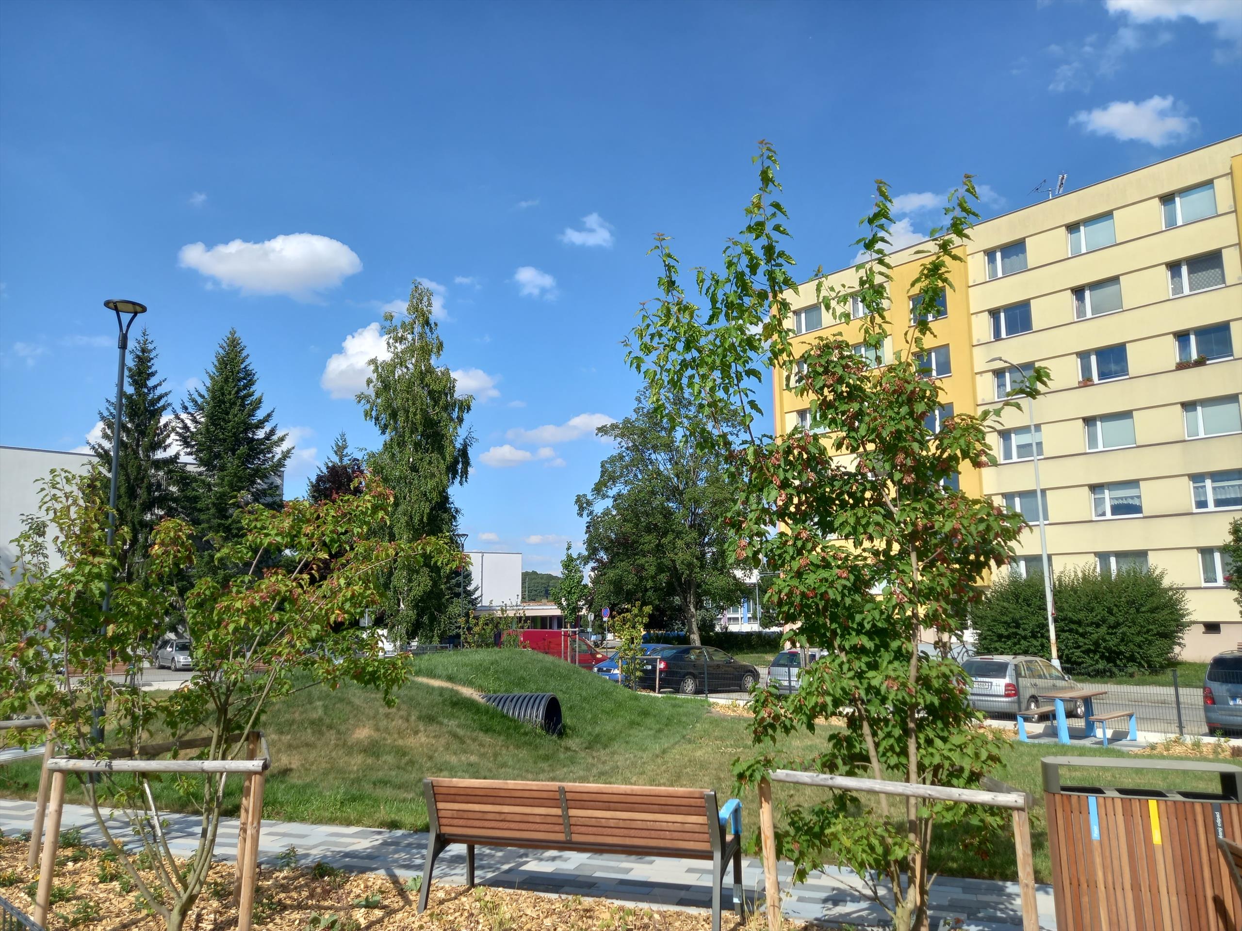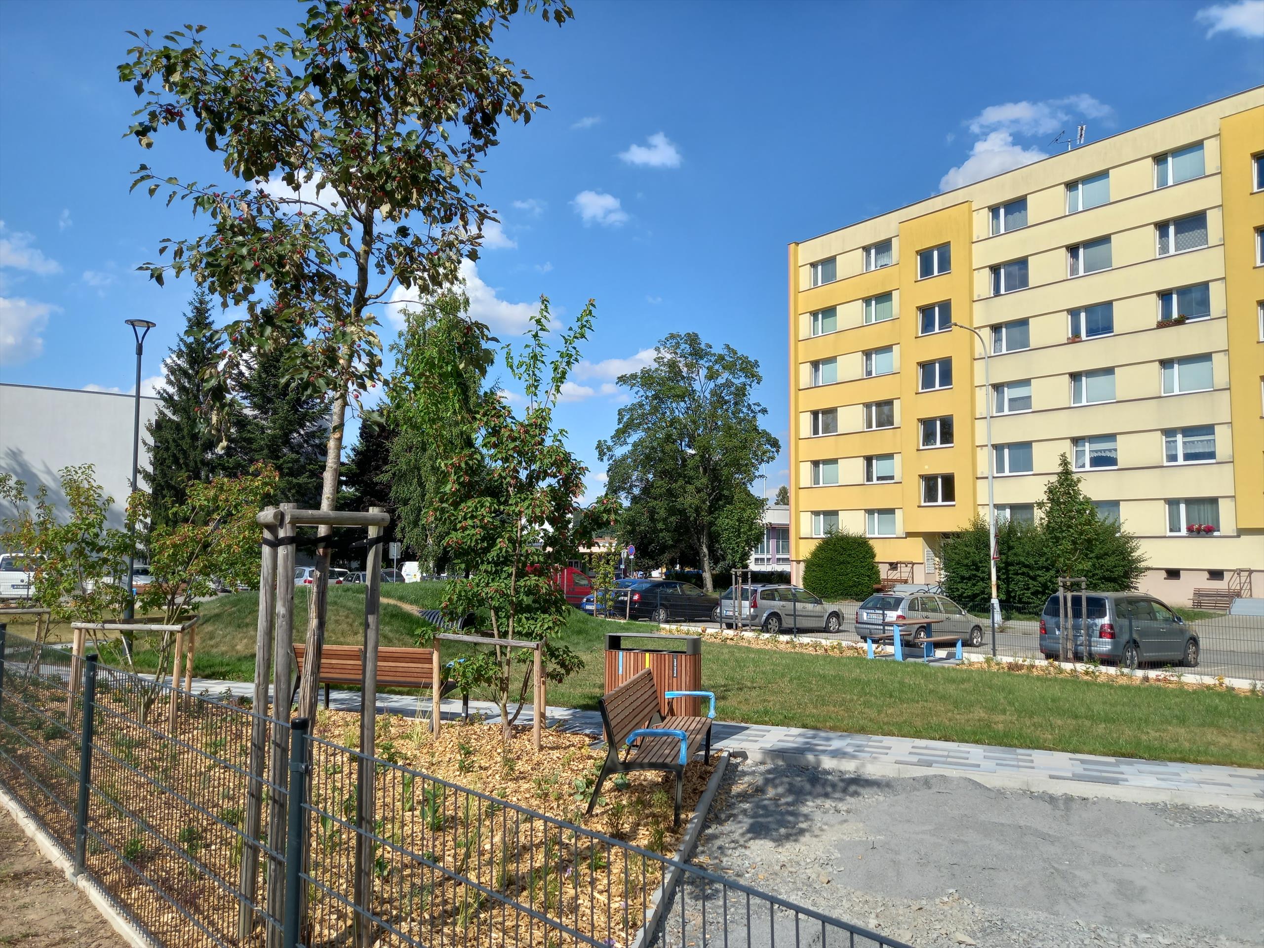 Nové chodníky, veřejné osvětlení a sadové úpravy, mobiliář, moderní dětské hřiště, včetně prolézacího tunelu. Oproti původnímu projektu došlo k několika úpravám i na základě požadavků občanů - výšková úprava terénu, posunutí plotu a vytvoření mlatového chodníčku podél parkoviště namísto kačírku, betonová konstrukce pod umělý povrch dětského hřiště, brána do oplocení pro vjezd techniky údržby. Nový prostor čeká ještě osázení cibulovinami. Termín realizace se posunuje na podzim letošního roku, náklady z městského rozpočtu jsou ve výši cca 6,7 mil. Kč.