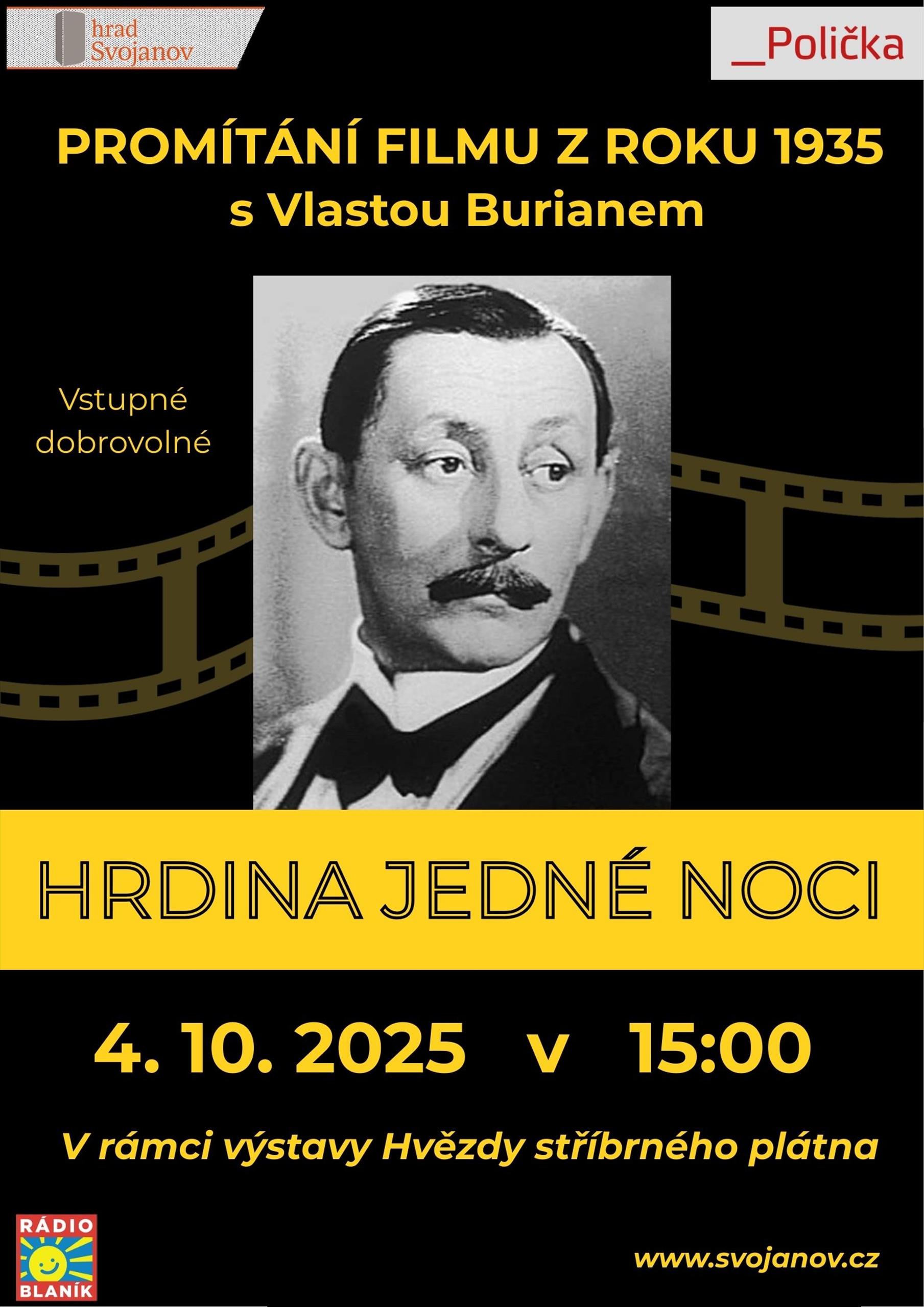 4. října 2025 od 15 hodin - promítání filmu s Vlastou Burianem - Hrdina jedné noci
