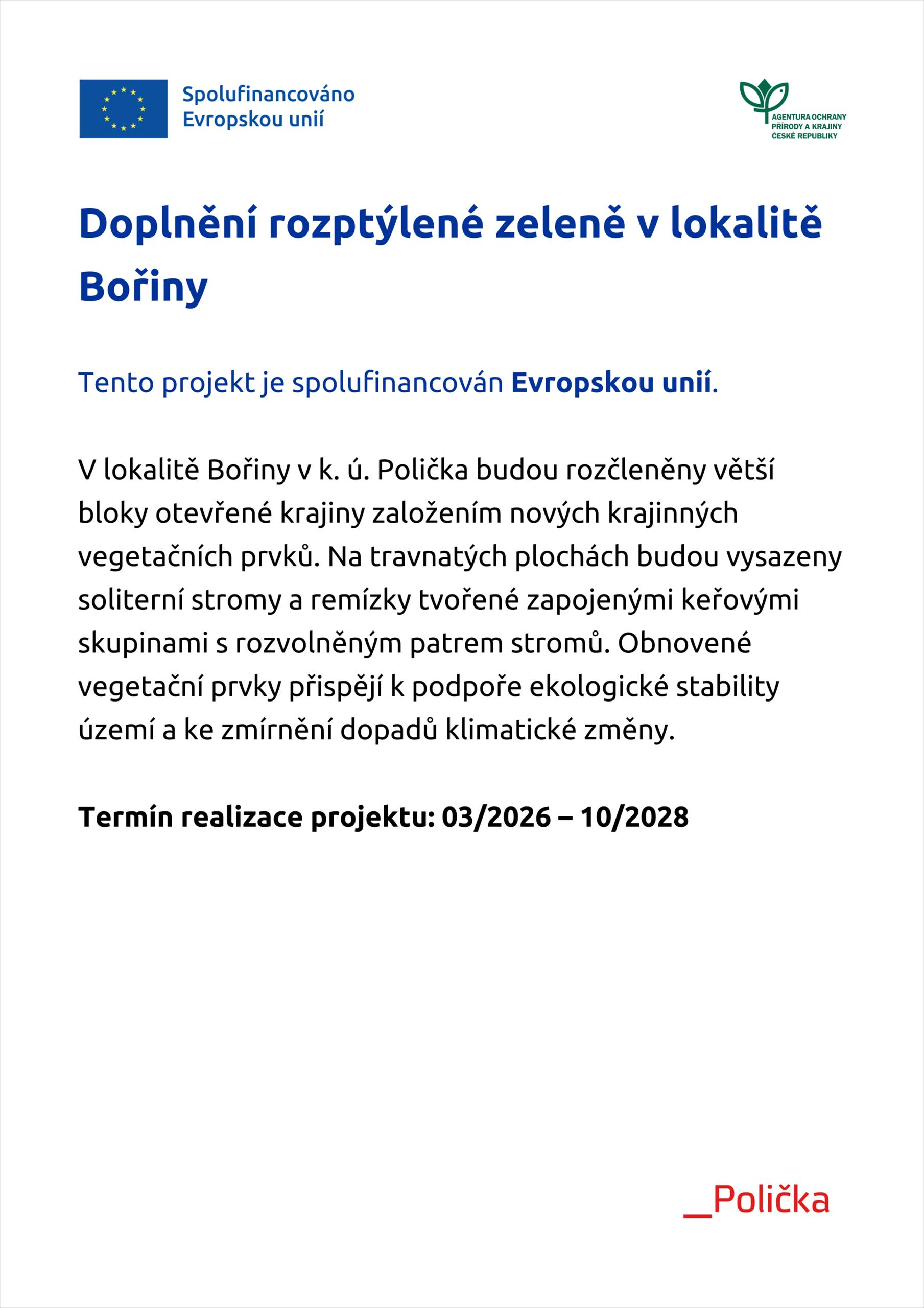 V lokalitě Bořiny v k. ú. Polička budou rozčleněny větší bloky otevřené krajiny založením nových krajinných vegetačních prvků. Na travnatých plochách bude vysazeno stromořadí starých nebo krajových odrůd třešní, tři remízky tvořené zapojenými keřovými skupinami s rozvolněným patrem stromů a 4 solitérní dřeviny, které podpoří místní krajinný ráz. Celkem je navrženo k výsadbě 61 stromů a 387 keřů. Součástí projektu je také následná péče po dobu tří let po výsadbě.