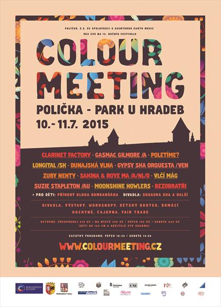 Multižánrový festival Colour Meeting druhý červencový víkend podvanácté probarví hudbou a divadlem poličský park u Synského rybníka. I letos je cílem pořadatelů představit méně známé a o to zajímavější a poutavější tuzemské i zahraniční interprety a to vše zpříjemnit rodinnou atmosférou.